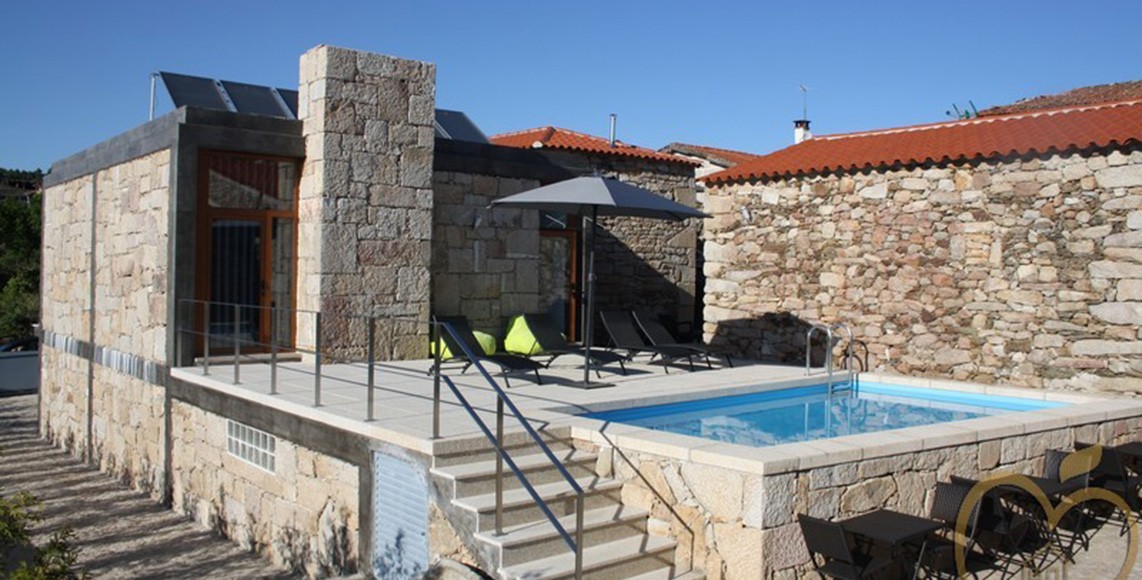 Exteriormente oferece uma paisagem rural em perfeita harmonia com a natureza, bem como piscina e barbecue que convidam a momentos de prazer.