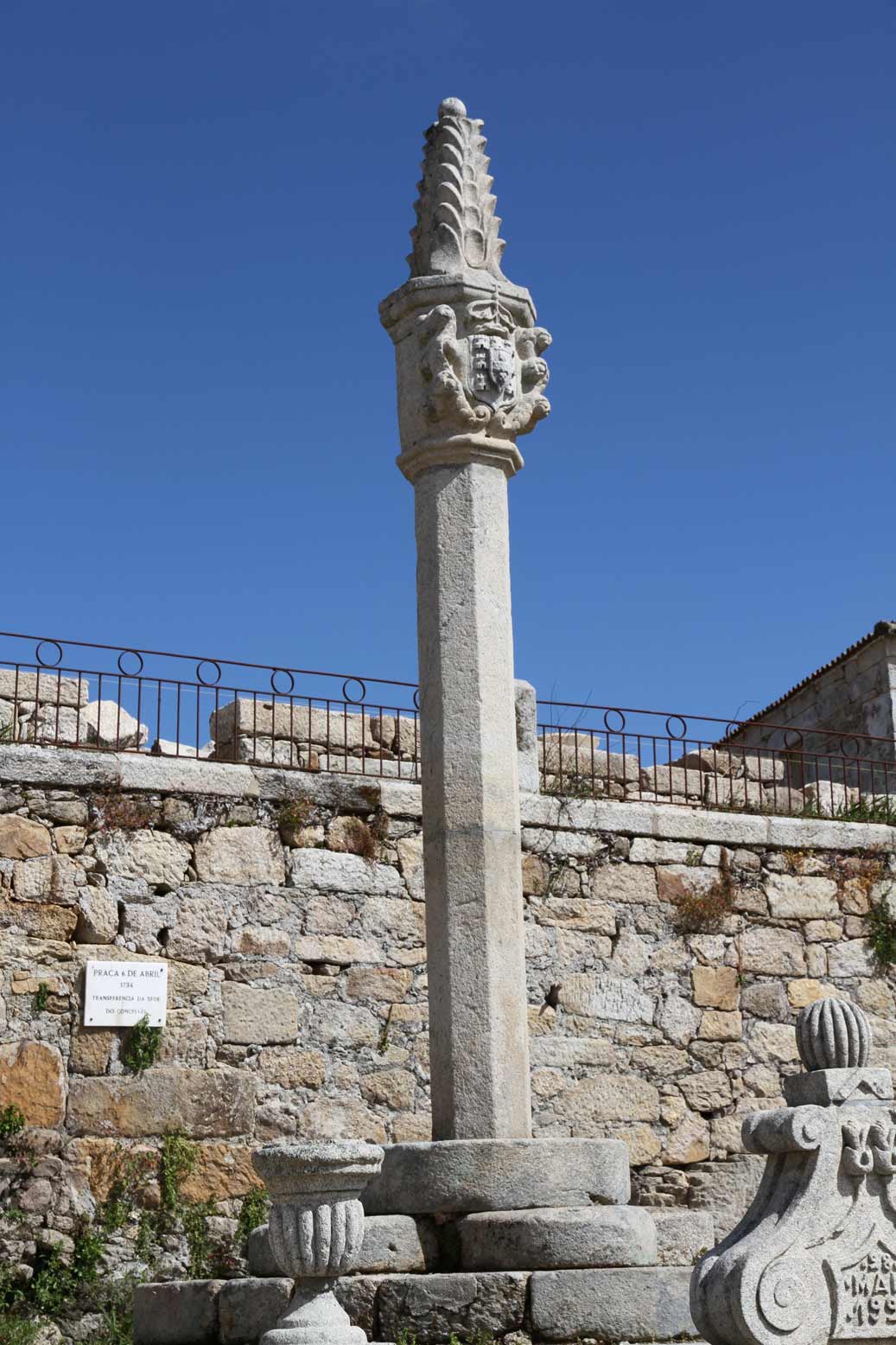 O atual concelho de Carrazeda de Ansiães, com foral do séc. XI, tinha a sua sede na antiga vila de Ansiães, abandonada após a transferência para Carrazeda, no século XVIII. O pelourinho da vila de Ansiães foi destruído a 6 de abril de 1734, quando por alvará de D. João V Carrazeda subiu à categoria de vila; a destruição destinava-se a enfraquecer a memória do estatuto anteriormente detido por Ansiães. Na sequência desta destruição foi levantado novo pelourinho, que ainda se conserva, na praça 6 de abril, em frente à atual Biblioteca Municipal, que outrora foi cadeia, tribunal e Câmara Municipal). O pelourinho assenta sobre plataforma de quatro degraus, sendo o degrau inferior de secção quadrangular, o segundo circular, o terceiro polilobado, e o último novamente circular, servindo de base à coluna. A coluna é composta por fuste oitavado, de faces lisas, e o capitel é antecedido por uma estreita moldura oitavada. É prismático, de secção octogonal, e saliente, apresentando um escudo de armas de D. João V, envolvido por enrolamentos vegetalistas (grossas vergas com rebentos) de tipo barroco. O remate é troncocónico, bastante elevado, e todo ornado com escamas, tendo o topo truncado.